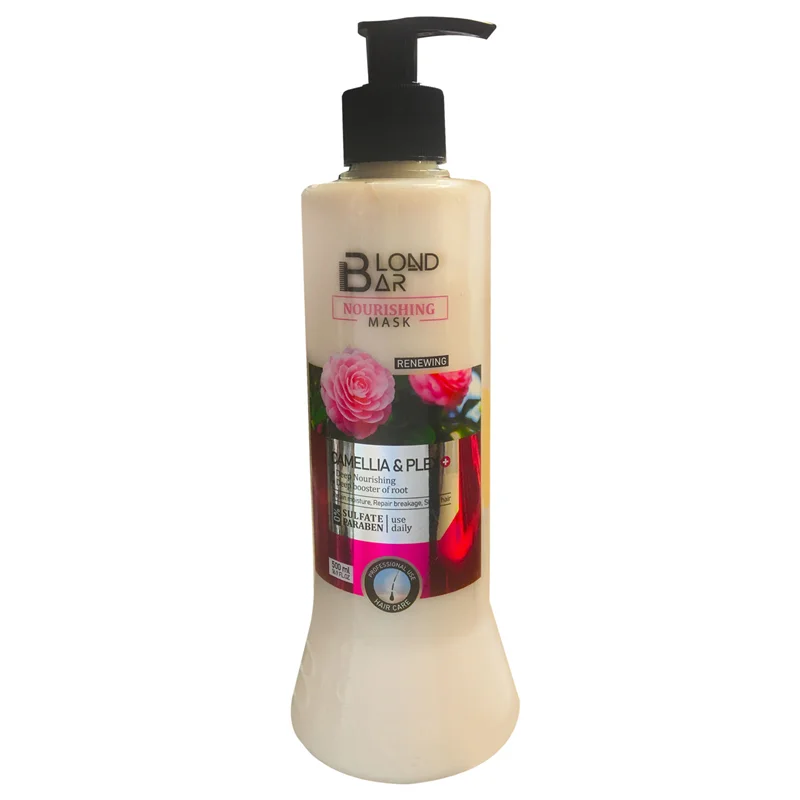 ماسک مو فاقد سولفات و فاقد پارابن بلوند بار حاوی روغن گیاه کاملیا میباشد که در تقویت عمیق ریشه ها و بسیار مغذی برای انواع موها و احیا کننده نیز میباشد. همچنین موثر در درخشندگی موها و کاستن حالت الکتریسیته ساکن در موها است. کراتین و کلاژن هیدرولیز شده ، عصاره ی جوانه گندم و سدر، روغن فندق و هسته انگور و آرگان و روغن کاملیا از مواد موجود در این ماسک مو میباشد. مصرف این ماسک میتواند به صورت روزانه هم باشد.حاوی پلکس و عصاره ی گل کاملیا نیز میباشد.